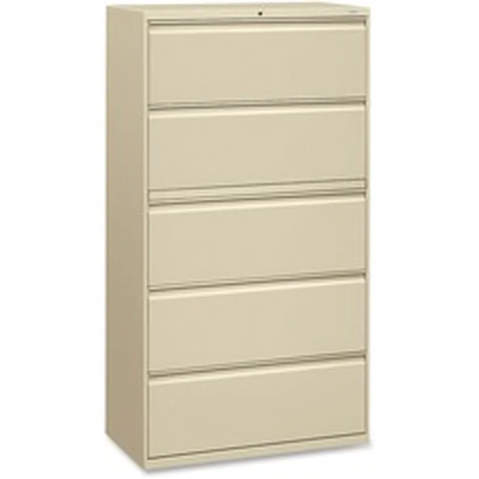 Five-drawer lateral file offers clean lines, reinforced case construction, dual side locks for security, and full-width, designer-style handles. Baked enamel finish over rust-inhibiting, phosphate pretreatment adds more durability. Three-part, telescoping, ball-bearing suspension delivers smooth drawer operation. Putty-colored lateral file includes four fixed drawers, and the top drawer is a roll-out shelf with a receding flipper door. Ideal for binders, end-tab files, standing files or supplies. Drawers accommodate letter-size or legal-size folders from side-to-side with included adjustable hangrails. Drawers are flush at the top and sides and feature drawer-extension restraint. Mechanical interlock allows only one drawer to open at a time. Lateral file also offers four adjustable leveling guides for stabilizing and HON One Key interchangeable, core-removable lock. Lock mechanism secures both sides of drawers.