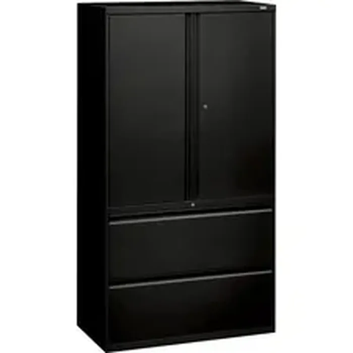 Lateral file with cabinet storage is built to withstand all your storage demands. It features locking, hinged doors with bevel pulls and two adjustable shelves that adjust in 2" increments. Bottom of cabinet has two lateral file drawers with full-width radius pulls, steel ball-bearing suspension, and adjustable hangrails for side-to-side, letter-size/legal-size filing. Mechanical interlock inhibits the extension of more than one drawer at a time. "One-Key" core-removable locks on door and on file lock independently. Black lateral file has four adjustable leveling guides. File is certified by SCS to be in compliance with specific, indoor, air-quality emission requirements and meets or exceeds applicable ANSI/BIFMA standards.
