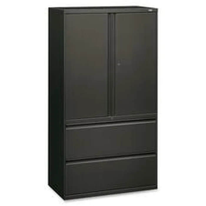 Lateral file with cabinet storage features locking hinged doors with bevel pulls and two adjustable shelves that adjust in 2" increments. Inside height of cabinet is 36-1/4". Bottom of cabinet has two lateral file drawers with full-width bevel pulls, steel ball-bearing suspension, and adjustable hangrails for side-to-side letter-size/legal-size filing. "One-Key" core-removable locks on door and on file lock independently. Charcoal lateral file has four adjustable leveling guides. File is certified by SCS to be in compliance with specific, indoor, air-quality emission requirements and meets or exceeds applicable ANSI/BIFMA standards.