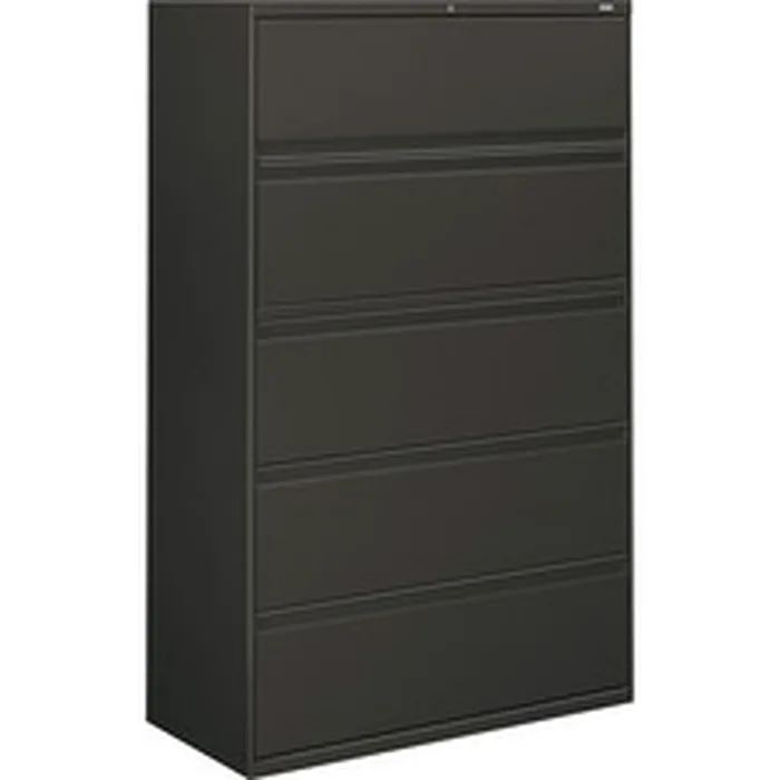 Five-drawer lateral file offers clean lines, reinforced case construction, dual side locks for security, and full-width, designer-style handles. Baked enamel finish over rust-inhibiting, phosphate pretreatment adds more durability. Three-part, telescoping, ball-bearing suspension delivers smooth drawer operation. Charcoal lateral file includes four fixed drawers, and the top drawer is a roll-out shelf with a receding flipper door. Ideal for binders, end-tab files, standing files or supplies. Drawers accommodate letter-size or legal-size folders from side-to-side with included adjustable hangrails. Drawers are flush at the top and sides and feature drawer-extension restraint. Mechanical interlock allows only one drawer to open at a time. Lateral file also offers four adjustable leveling guides for stabilizing and HON One Key interchangeable, core-removable lock. Lock mechanism secures both sides of drawers.