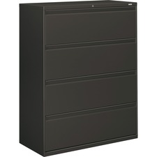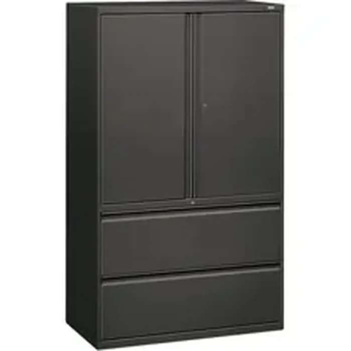 Lateral file with cabinet storage features locking hinged doors with bevel pulls and two adjustable shelves that adjust in 2" increments. Inside height of cabinet is 36-1/4". Bottom of cabinet has two lateral file drawers with full-width bevel pulls, steel ball-bearing suspension, and adjustable hangrails for side-to-side letter-size/legal-size filing. "One-Key" core-removable locks on door and on file lock independently. Charcoal lateral file has four adjustable leveling guides. File is certified by SCS to be in compliance with specific, indoor, air-quality emission requirements and meets or exceeds applicable ANSI/BIFMA standards.