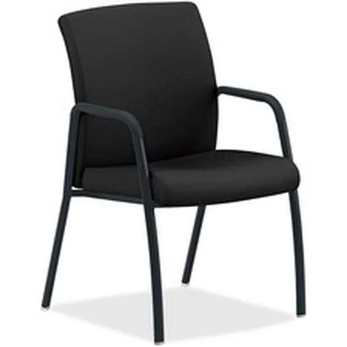 Guest chair with arms is part of the HON Ignition Seating Series that fits all body types from the 5th to the 95th percentile. This guest chair stacks up to four high, making it excellent for private offices, training rooms, common areas and multipurpose rooms. Cushioned back and seat are upholstered in fabric for an elegant look. Deeply sculpted lumbar support cradles the lower back. Seat and back core structures are made from recycled wood for strength and sustainability. Polyester fabric features Nano-Tex soil-repellent and stain-repellent technology. Design features also fixed arms, a four-leg base with glides and a durable, steel frame for long-lasting use. Seat-to-floor distance is 18-1/2" high. Seat measures 19-1/2" wide x 16-3/4" deep. Back is 19-1/2" wide x 20" high. Chair holds up to 300 lb. Guest chair meets or exceeds applicable ANSI/BIFMA standards.