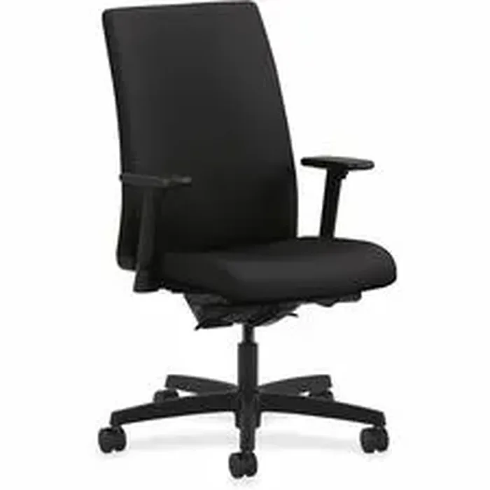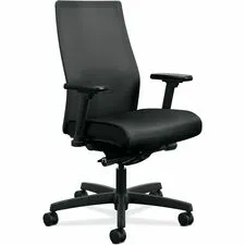 Mid-back Task Chair is designed to provide comfortable support for those who spend more than half the day at their desk or computer. As part of the HON Ignition Seating Series, this chair is perfect behind a desk or around a conference table. Deeply sculpted lumbar support cradles the lower back. Synchro-tilt and independent back angle deliver an exceptional range of motion. Other functions include pneumatic seat-height adjustment from 17-1/2" to 22" , seat-glide mechanism, back-angle adjustment, ratchet back-height adjustment from 21" x 24" , 360-degree swivel, tilt, tilt tension, tilt lock and synchronized knee tilt. These functions make it feel like the chair was designed just for you. Arms adjust in height and width for upper body support wherever it feels best. Weight capacity is 300 lb. Design also features black fabric upholstery; five-star base; and dual-wheeled casters for easy mobility.