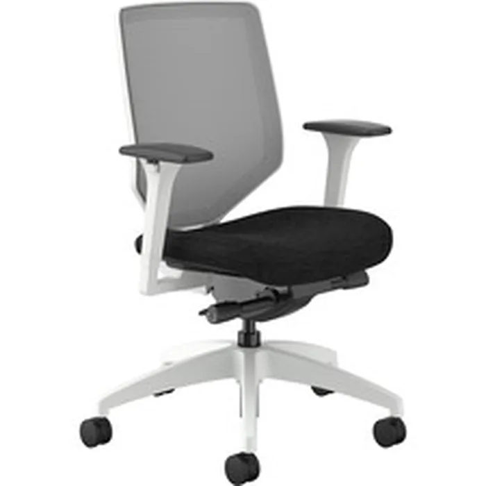 Solve is the single seating solution that helps a variety of users achieve optimal comfort. This mid-back task chair looks brilliant with a Designer White frame and feels even better with its advanced synchro-tilt recline control. Synchronized seat and back provide proper balance, alignment and lumbar support, and can be adjusted with a single lever. Mid-back task chair features a responsive, four-way stretch mesh back to provide all-day comfort and support. Arms adjust from 7-4/11" to 11-4/11" in height and 17-3/8" to 20-1/8" in width. Functions include pneumatic seat-height adjustment, seat-glide mechanism, 360-degree swivel, dual-action synchro tilt, tilt tension and tilt lock. 26-1/2" diameter, five-star base is equipped with 2-4/11" dual-wheeled casters for easy chair movement. Seat is upholstered in black fabric and measures 19" deep x 19" deep. Mid-back is 18" wide, and the mesh color is Fog. Weight capacity is 300 lb.