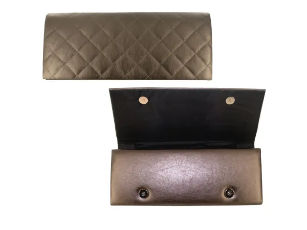 Elevate your nightlife look with our chic quilted pewter wristlet. Perfect for holding your essential items like lipstick, house keys, or cards, this stylish accessory seamlessly transitions into a cosmetic bag by removing the handle. Its compact size of 7 1/2" x 3" makes it easy to carry and the 7" removable strap adds versatility.
