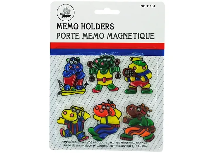 Add a playful touch to your workspace with these colorful magnetic hippo memo holders. Featuring a vintage design, these fun magnets come in a variety of poses, including weightlifting, playing tennis, and doing aerobics. Each set includes 6 unique magnets that stick effortlessly to any steel surface, making them perfect for holding notes, reminders, or pictures. The set is elegantly packaged on a blister card with a convenient hanging hole, making it a perfect gift for animal lovers or anyone looking to spice up their office decor. Magnets measure approximately 2" x 3".