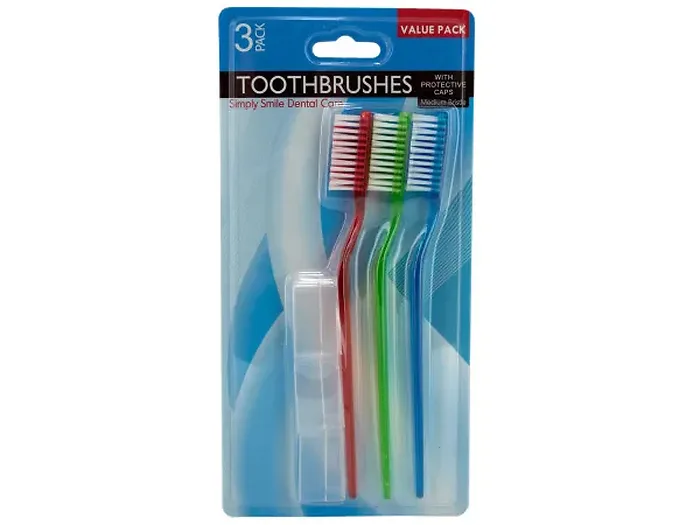 This set includes 3 comfort grip toothbrushes designed for an enjoyable brushing experience. Each toothbrush features medium nylon bristles with vibrant color centers that coordinate with the handle colors: blue, green, orange, pink, purple, red, and yellow.