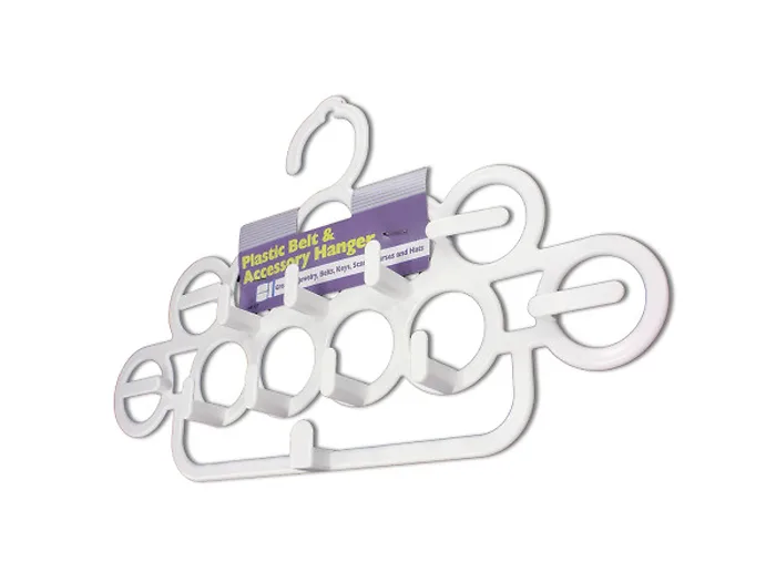 Great for jewelry, belts, keys, scarves, purses and hats, this Belt & Accessory Hanger features a durable plastic hanger with 12 hooks for all organizing needs. Measures approximately 13 3/4" x 8 1/4". Comes packaged with a wrap around.