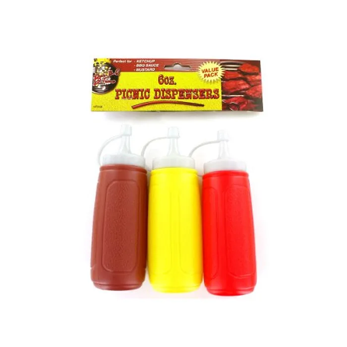 Great for your picnic or outdoor barbecue, this 3-piece Picnic Condiment Dispensers Set features squeeze bottles with flip top caps that stay on the bottle for easy resealing. Each bottle is colored to match ketchup, mustard and barbecue sauces. Each dispenser measures approximately 6.5" high. Comes packaged in a poly bag with a header card.