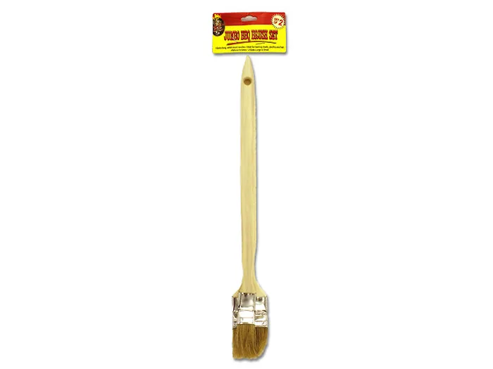 Jumbo Barbecue Brush SetYou won't ever have to worry about getting your hands too close to the grill again with this set of two barbecue brushes with extra long, solid wood handles and natural bristles. These brushes are ideal for basting meats, poultry and fish. There are 1" and 2" wide brushes in each set. Each brush measures approximately 17" long. Comes packaged in a poly bag with a header card.Colors: Silver, BeigeMaterials: Metal, Wood, NaturalBrand: Bar B Q TimeWholesale Outdoor Cooking