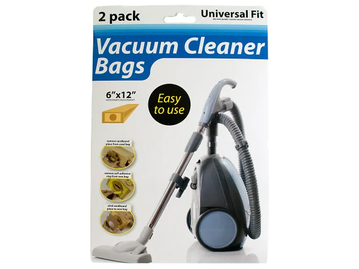 Keep your vacuum cleaner working smoothly and odor-free with this 2-piece Universal Fit Vacuum Cleaner Bags Set featuring easy-to-use self-adhesive bags made of thick paper with cardboard reinforcements. Fits most upright/canister vacuum cleaners. Each bag measures approximately 6" x 12". Comes shrink wrapped.