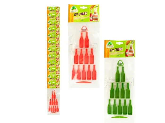 Create refreshing ice cubes that mimic the beloved Jarritos bottles with the Jarritos Bottle-Shaped Ice Cube Tray. This innovative tray is crafted from durable plastic and includes 11 flexible molds, allowing you to easily make ice cubes in the shape of your favorite Jarritos drinks. Simply fill the tray with water or any Jarritos soft drink and freeze. It comes packaged in a convenient hanging poly bag and is available in assorted colors. Plus, it's BPA free for safe use!