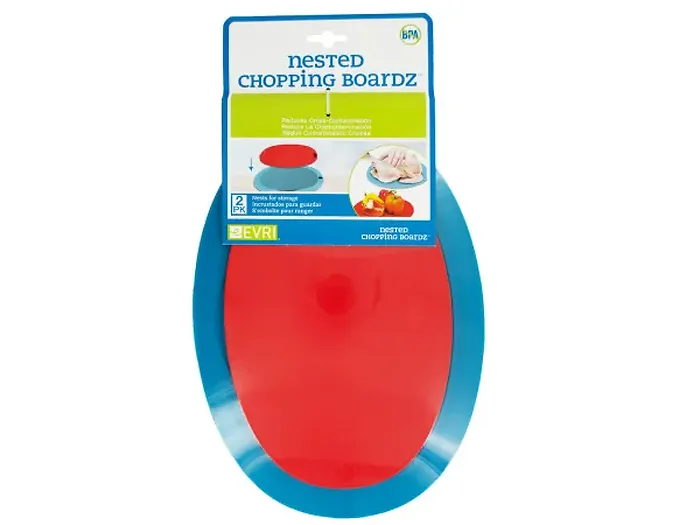 Reduce cross-contamination in your kitchen with our Color-Coded Nested Chopping Boards Set. This 2-piece set features durable plastic cutting boards that conveniently nest for easy storage. The large blue board (12.25" x 9") is labeled with a chicken, while the smaller red board (10.5" x 7") is labeled with a tomato, helping you keep your food prep organized.