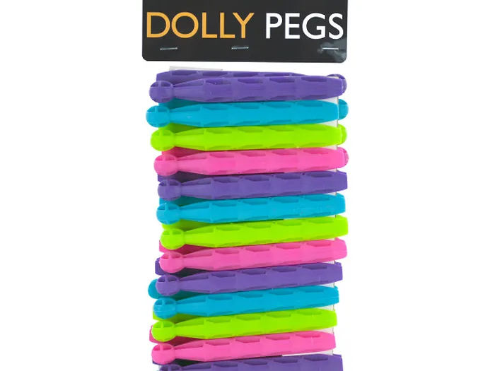 Great for hanging clothes and craft use, this 30-piece Dolly Peg Clothespins Set features colorful clothespins made of durable plastic in a classic shape. Each clothespin measures approximately 4.25" long. Comes packaged in a poly bag with a header card.