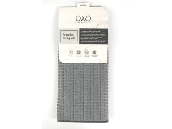 The Dishes 'N More Extra Absorbent Dish Drying Mat is perfect for efficiently drying dishes and other wet items. Its innovative design includes a fast-drying foam-padded cloth mat that offers exceptional absorbency along with a mesh underside for improved airflow. The mat features vibrant piping and a convenient hanging loop for easy storage. Machine washable, this mat is practical and stylish, making it a must-have for any kitchen.