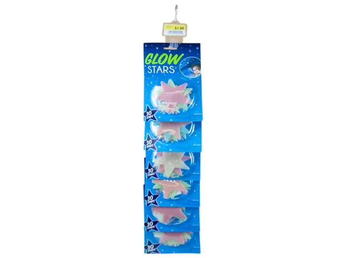 Transform your room into a cosmic wonderland with our 30 Pack Glow-in-the-Dark Stars. Perfect for ceilings and walls, these stars will light up your space when the lights go out. Each star varies in size and color, creating a vibrant and enchanting night sky experience. The stars come with foam adhesive stickers for easy application and are packaged in a convenient hanging panel blister pack. The clip strip includes a total of six packs of 30 glow stars to help you illuminate your surroundings.