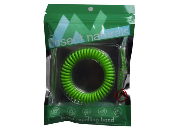 Repel mosquitos and keep bugs away with this beyond convenient and comfortable Natural Insect Eliminating and Repelling Bracelet. The bracelet is a plastic coiled bracelet infused with natural insect repelling actives that help keep pesky bugs at bay. Just slip it on to enjoy a bug-free day. Especially perfect for concerts, hikes, camping trips, nighttime adventures, and outdoor work. The wrist bands are non-toxic, waterproof and leave no oily mess as opposed to spray-on repellents. Each bracelet comes packaged in a green plastic box with a yellow bracelet inside.