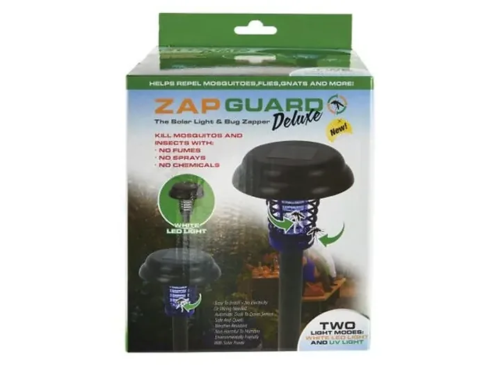 The Zap Guard Deluxe is a solar-powered bug zapper that effectively kills mosquitoes and other insects without the use of harmful chemicals or sprays. Ideal for camping, gardening, fishing, and hiking, this eco-friendly device serves as both a light source and an insect repellent.