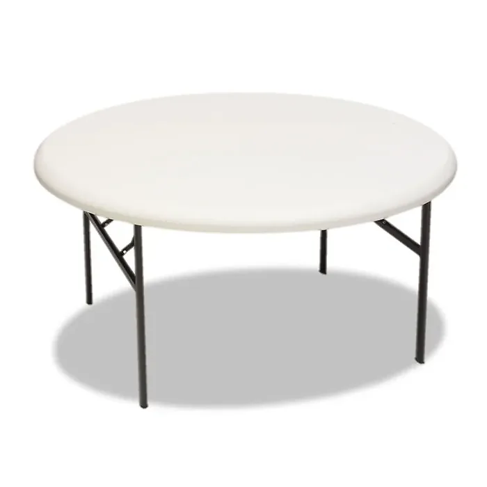 Round folding table is made for heavy-duty use indoors or outdoors yet is 30 percent lighter than standard folding tables. Sturdy construction holds 600 lb. evenly distributed. 2" tabletop is made of durable, blow-molded, high-density polyethylene that is dent-resistant and scratch-resistant. Tubular legs are made of heavy-gauge steel with a powder-coat finish. Legs fold into recessed cavities beneath the table. Folding table is designed to nest with other Iceberg IndestrucTable Too tables when stacking to allow maximum storage capacity.