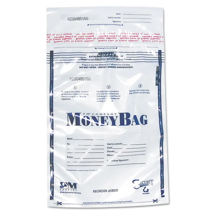 Disposable deposit bags are designed to detect tampering with contents. Tough, co-extruded film withstands rough handling and shifting of heavy contents. Clear design allows easy identification of the contents. Tamper-evident deposit bags meet all regular shipping requirements and are sequentially numbered for tracking.
