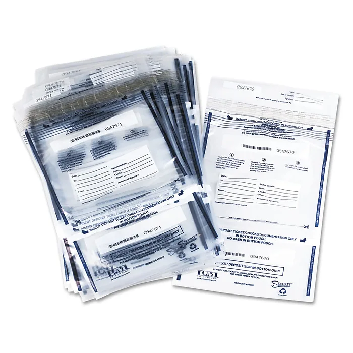 Disposable deposit bags reveal tampering and offer a unique dual-bag design with a tear-off receipt. Detachable bottom pouch is ideal for required separation of cash, checks and receipts. Tamper-evident, pouch-welded deposit bags feature a clear front and back for easy identification and are sequentially numbered for tracking. Each bag is made of 6.0 mil plastic.