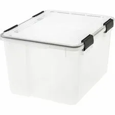 Store your favorite keepsakes and other valuables in this heavy-duty storage tote. The weathertight seal on the storage bin lid protects your contents by keeping air and moisture out. The grooves in the reinforced lid allow you to stack additional totes for space-saving storage. Four buckle latches keep your contents securely contained. BPA-free, acid-free construction prevents the plastic from dulling over time for lasting clarity. Storage tote is perfect for crafting supplies, camping gear, clothing and more.