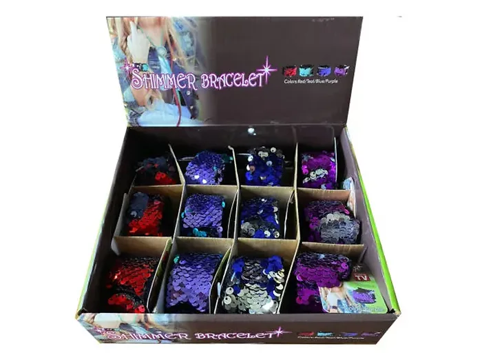 Each bracelet is embellished with shimmering sequins that catch the light beautifully, ensuring you stand out in a crowd. The assortment includes four vibrant colors: red, teal, blue, and purple, each featuring three bracelets per color in a convenient countertop display.