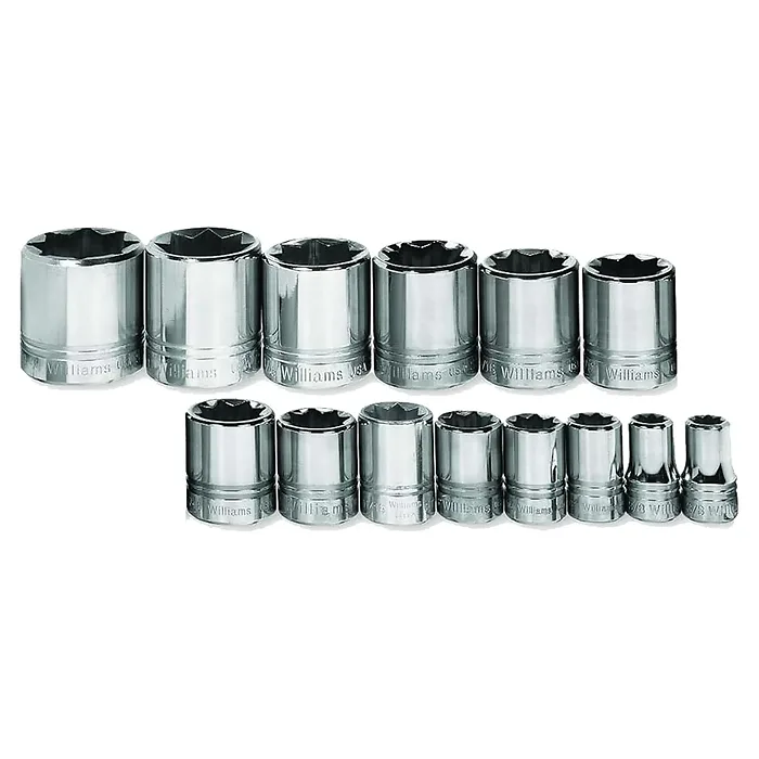 The Williams 1/2" Drive Shallow SAE Socket Set is designed for durability and convenience. This high-quality 14-piece socket set includes various sizes of 8-point sockets, perfect for a wide range of automotive and mechanical applications. Each socket is mounted on a sturdy clip rail for easy organization and access.