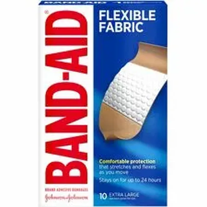 General InformationManufacturer:Johnson & Johnson Consumer Inc. Manufacturer Part Number:5685 Manufacturer Website Address:http://www.jnj.com Brand Name:Band-Aid Product Name:Flexible Fabric Adhesive Bandages - Extra Large Marketing Information:Try Band-Aid Brand Sterile Flexible Fabric Adhesive Bandages to cover and protect minor wounds, cuts, scrapes and burns. Memory Weave fabric stretches and flexes as you move for all-day comfort and flexibility. Each fabric bandage features a Quilt-Aid Comfort Pad to cushion and protect painful wounds while you heal to help prevent re-injury. Hurt-Free Pad won't stick to the wound as they wick away blood and fluids, allowing gentle, pain-free removal. From a doctor-recommended bandage brand, these extra-large adhesive bandages help protect against dirt and germs that may cause infection for up to 24 hours, making them a great addition to a first aid kit or wound care supplies. Plus, wounds covered with a bandage heal faster than uncovered wounds. For proper wound care, change bandage daily. Packaged Quantity:10 / Box Product Type:Adhesive Bandage