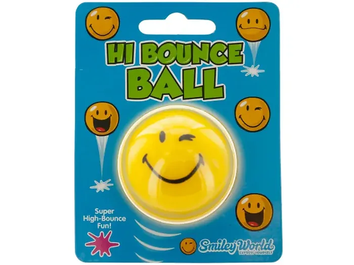 The High-Bounce Smiley Face Ball is the perfect toy for children who love to play and have fun! This cheerful yellow ball, adorned with a winking smiley face, bounces to impressive heights, providing endless entertainment. Packed in a convenient blister pack, it makes for an excellent gift or party favor.