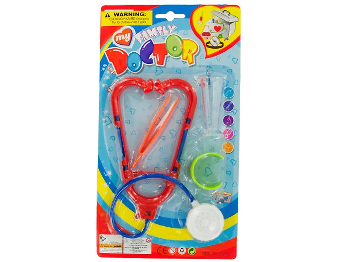 Great for hours of pretend play, this Doctor Play Set features colorful plastic pieces in large sizes for small hands. Three or four-piece set comes with a stethoscope and may include tweezers, scissors, a syringe, bandage and more. Comes in assorted styles. For ages 3 and up. Comes packaged in a blister pack.