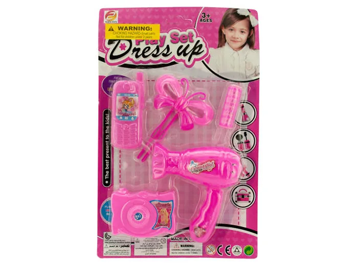 Girls will love playing for hours with this cute 6-piece Dress Up Beauty Play Set featuring a variety of play tools and accessories made of bright pink plastic. Set includes a hair curler, hair comb accessory, lipstick, perfume bottle, flower shaped mirror and leaf shaped hair brush. For ages 3 and up. Comes packaged in a blister pack.