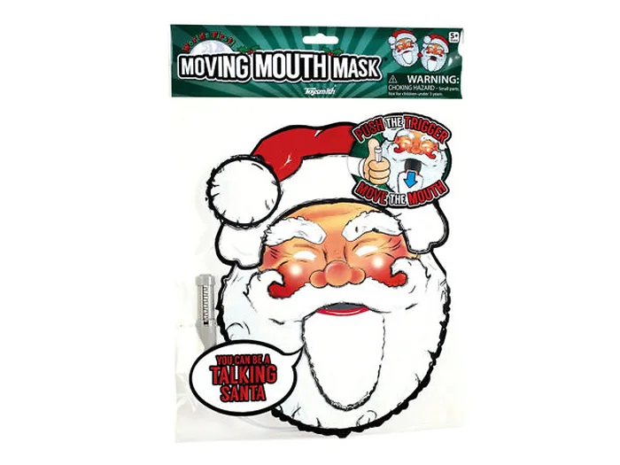 Pretend to be a talking Santa with this fun Talking Headz Santa Moving Mouth Mask featuring a unique cardstock mask of Santa's face with eye holes and a mouth that moves up and down like it's talking. Push the trigger to move the mouth. For ages 5 and up. Comes packaged in a poly bag with a header card.
