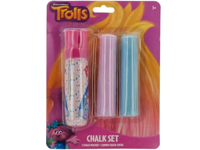 Brighten up your outdoor playtime with the Trolls Giant Chalk Set! Perfect for sidewalks and chalkboards, this set is an excellent addition to any child's art supplies. With vibrant colors, kids can create beautiful drawings on driveways or bring their imaginative ideas to life on black paper. The set comes with an easy-to-use chalk holder featuring fun Trolls graphics and includes two jumbo chalk sticks in assorted colors. Ideal for children ages 3 and up, this chalk set ensures hours of creative fun.