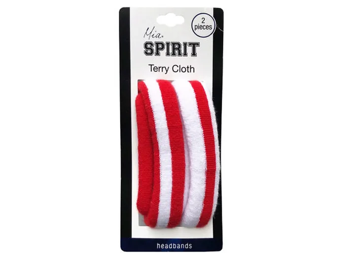 The Mia Spirit Terry Cloth Headbands are soft and stretchy headbands for sports. The absorbent terry cloth headbands are commonly used for soccer, basketball, running, cheer and more. The red and white color also makes them a wonderful patriotic accessory. Headbands measure .75 wide. One size fits all. Comes packaged on a hanging panel.