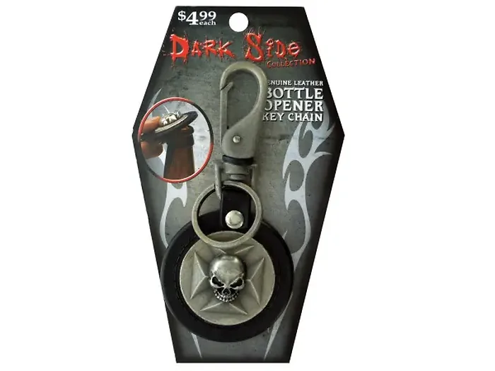 Make a statement with our Heavy Duty Skull & Crossbones Bottle Opener Keychain. This rugged accessory features a striking skull and crossbones design on a round black keychain, crafted with durable oxidized metal hardware. Perfect for tough guys and girls, this bottle opener not only adds style but also practicality to your keychain.