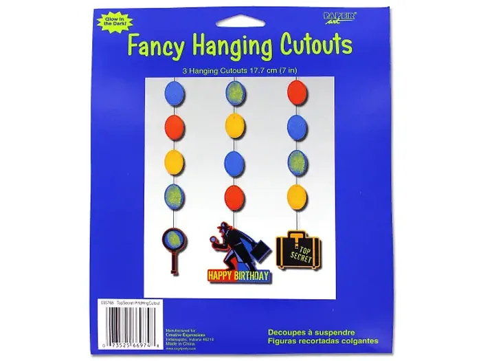 Each cutout hangs approximately 3' long and illuminates in the dark, adding an exciting element to your party décor. Comes carded in a poly bag for easy display.
