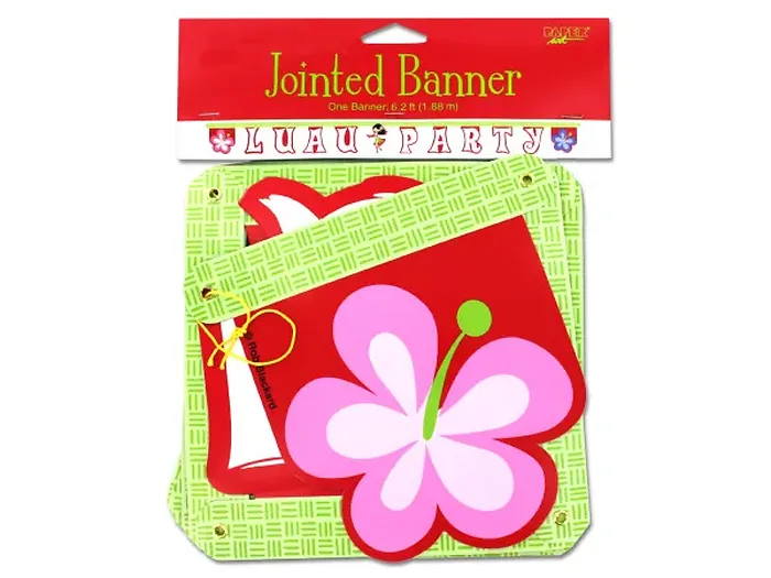 Celebrate your next tropical themed event with our Luau Party Jointed Banner! This vibrant 6.2 ft. banner features a green border complemented by red and white letters spelling out 'Luau Party.' Each end of the banner is adorned with colorful blossoms, and a charming hula girl takes center stage. Perfect for decorating your party space, this banner is sure to bring fun and festivity to any celebration.