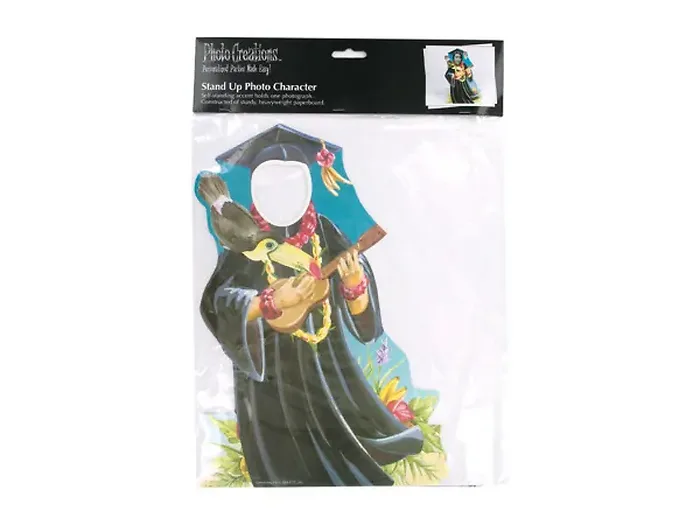 Celebrate your graduate's special day with this vibrant tropical-themed photo stand-up cut-out. This fun and interactive decoration allows you to place the graduate's photo behind the stand-up character, instantly transforming them into a ukulele-playing Hawaiian figure alongside a charming pet parrot.