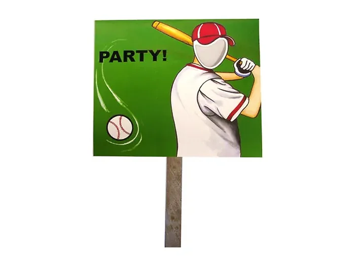 The sign comes with a 12" plastic stake for easy insertion into the ground and measures 14" x 15". The baseball player's face cutout is approximately 3" tall and 2 3/8" wide, providing the perfect spot for your favorite photo. With vibrant graphics of a player swinging a bat on a green background alongside the word 'Party', this sign is sure to attract attention!