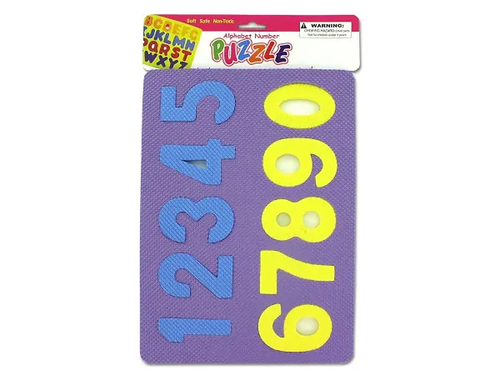 Ideal for preschoolers learning the alphabet and numbers, these Alphabet & Number Foam Puzzles feature numbers one through zero and the letters of the alphabet cut out in soft, safe, non-toxic foam shapes. Kids love foam puzzles and you'll love the educational value they provide. Each puzzle measures approximately 8.5" x 11.5" and is 0.25" thick. Comes in assorted colors and sizes. Comes packaged in a poly bag with a header card.