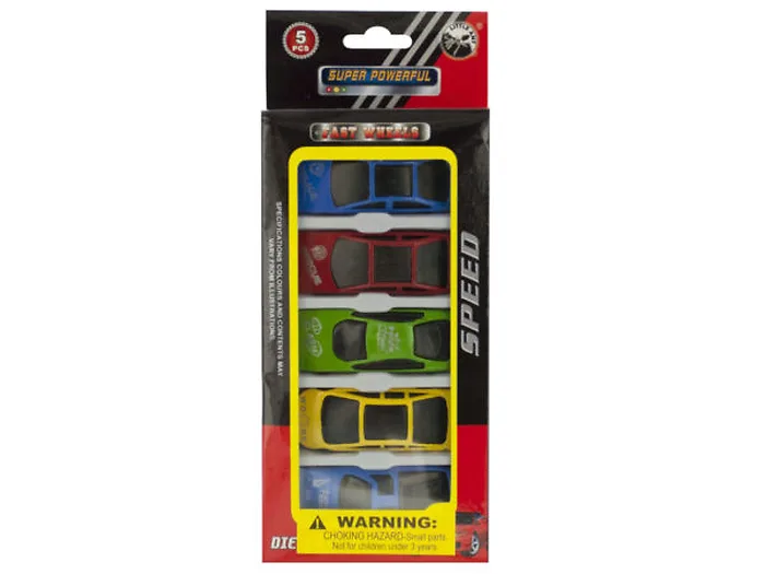 Kids will play for hours with this 5-piece Die Cast Metal Race Cars Set featuring realistic, colorful metal and plastic cars in a variety of styles with free-wheeling action. Just push and go! For ages 3 and up. Comes packaged in a hanging box. Box measures approximately 3.625" x 0.75" x 8.625".Available in a pack of 16Product Type: Bulk Buys