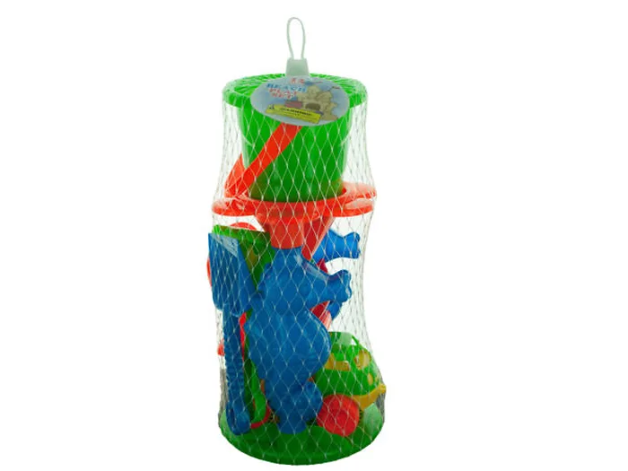 Perfect for playing and building with sand, this 12-piece Beach Play Set features a huge variety of plastic tools and toys in bright colors. Set includes: 4-piece standing sifter that can be taken apart to use the funnel, seahorse molds and sifter separately, a small bucket with a folding handle, 5 sea animal shaped molds, a shovel, scooper, rake, sifter and a movable dump truck. Comes in assorted colors: orange, green and yellow. For ages 3 and up. Comes packaged in a net bag with a hang tag.