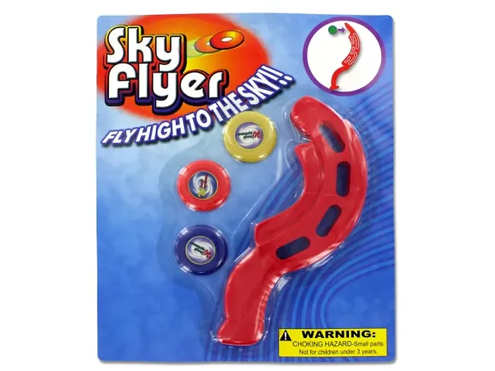 Experience the thrill of soaring disks with the Sky High Disk Flyer! This engaging toy set includes three colorful disks and an easy-to-use launcher, perfect for outdoor fun. Challenge your friends to see who can send their disk the highest! Designed for users of all ages, the launcher measures approximately 8 1/4" in length, while the disks have a diameter of about 1 6/8". Please note that it is not recommended for children under 3 years old. The product comes securely packaged in a blister pack for convenient storage.