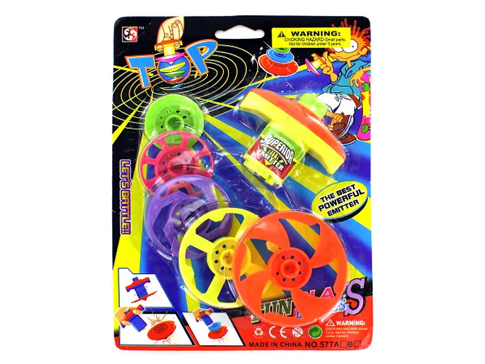 Keep kids entertained for hours with this Super Top Spinner featuring 5 brightly colored spinners in various sizes and 1 launcher. Just lock spinner into launcher, wind up, press release and watch spinners go! Colors include: purple, orange, yellow, pink and green. The emitter is approximately 2 3/8" x 2 3/4" x 3/4" and the plastic spinners diameters are 1 1/2", 1 13/16", 2 3/16", 2 9/16", and 2 15/16". Comes in assorted colors. Not recommended for children under 3. Comes packaged in a blister pack.