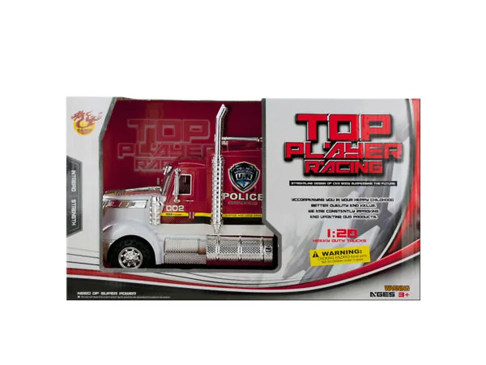 Great for hours of action-packed fun, this Friction Powered Police Semi-Trailer Truck features a realistic plastic truck with shiny silver parts, police decals and a trailer at the back. Kids love friction-powered toy trucks and no batteries are needed for endless hours of play. Truck measures approximately 13.5" long x 5.125" wide. For ages 3 and up. Comes packaged in an individual box. Box measures approximately 14.5" x 5.5" x 8.5".