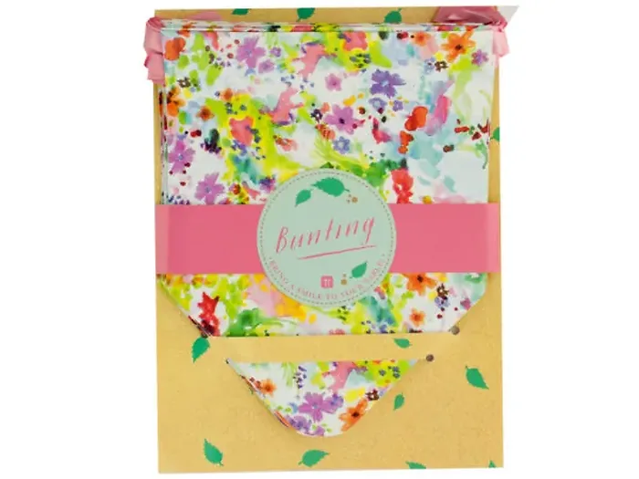 Add a touch of cheerful color to your celebrations with this Watercolor Floral Pennant Bunting. Each pennant features a beautiful watercolor floral print, elegantly strung together with a pink satin ribbon.