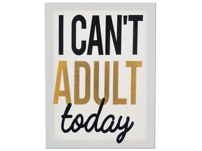 Add a playful touch to your home decor with the 'I Can't Adult Today' Canvas Wall Art. This charming piece features bold black and gold typography printed on a high-quality white canvas, elegantly wrapped around a durable composite wood frame.