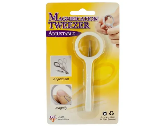 This Precision Adjustable Magnification Tweezer Tool is perfect for removing splinters and fine objects with utmost accuracy. It features a pointed metal tweezer combined with a small plastic magnifying glass, providing excellent visibility for detailed work. With an approximate length of 4 inches and a 1.125-inch diameter lens, this handy tool is a must-have for first aid kits and DIY projects.