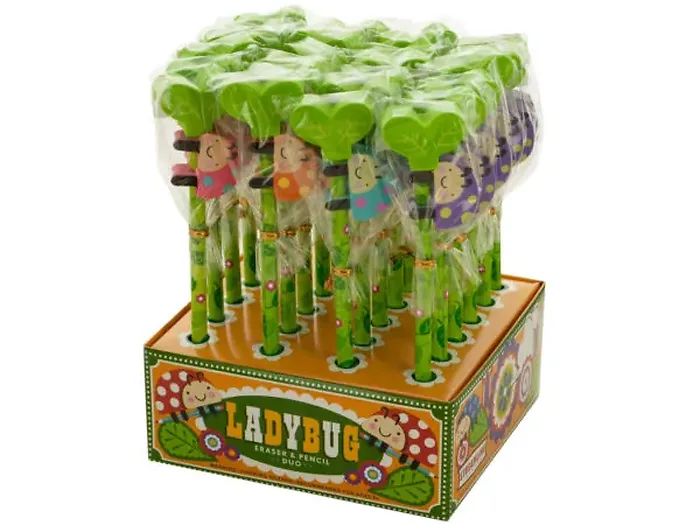 Make writing fun with this Colorful Ladybug Pencil and Eraser Set! Perfect for parties or everyday use, each set includes a charming wooden pencil adorned with a leaf and flower print, topped with delightful ladybug and leaf erasers. With four assorted colors of ladybug erasers, this set is sure to please kids and make learning enjoyable.